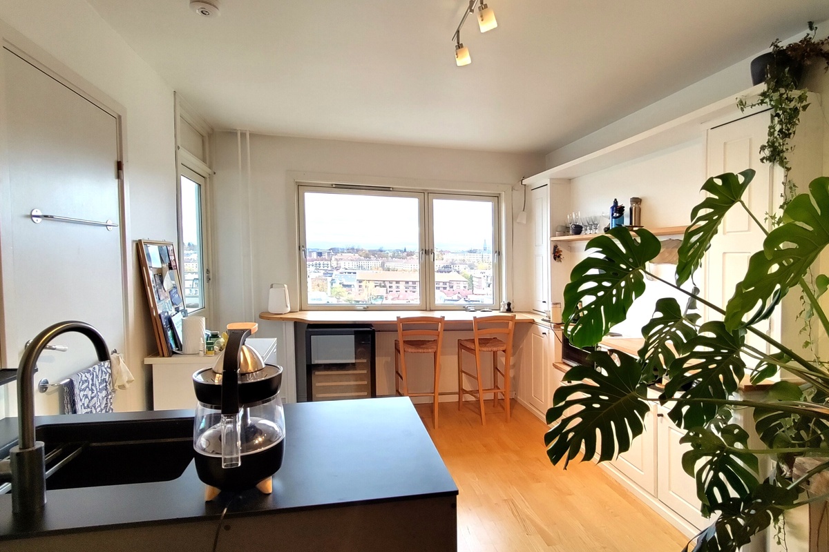 Koselig leilighet i 17.etasje, med fantastisk vestvendt utsikt og balkong. Åpen stue og kjøkkenløsning med masse lys og nydelige solnedganger. Oppvarming og varmtvann er inkludert. Jeg har selv bodd her i 12 år og trives utrolig godt.