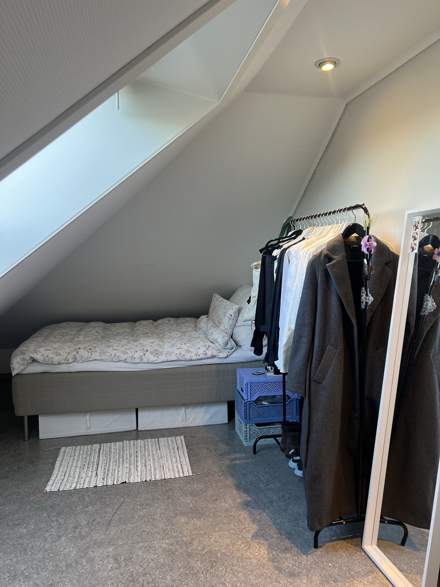 Leiligheten er i 3 etasje og er et koselig loft med kjøkken og stue adskilt, bad, inngangsparti og tre soverom. Rommet som er ledig (soverom 3 på plantegning) er satt til 4900kr i måneden + 500/3kr for internett og litt varierende for strøm (pleier ikke å være så mye). Depositum på rundt 3x månedsleie.