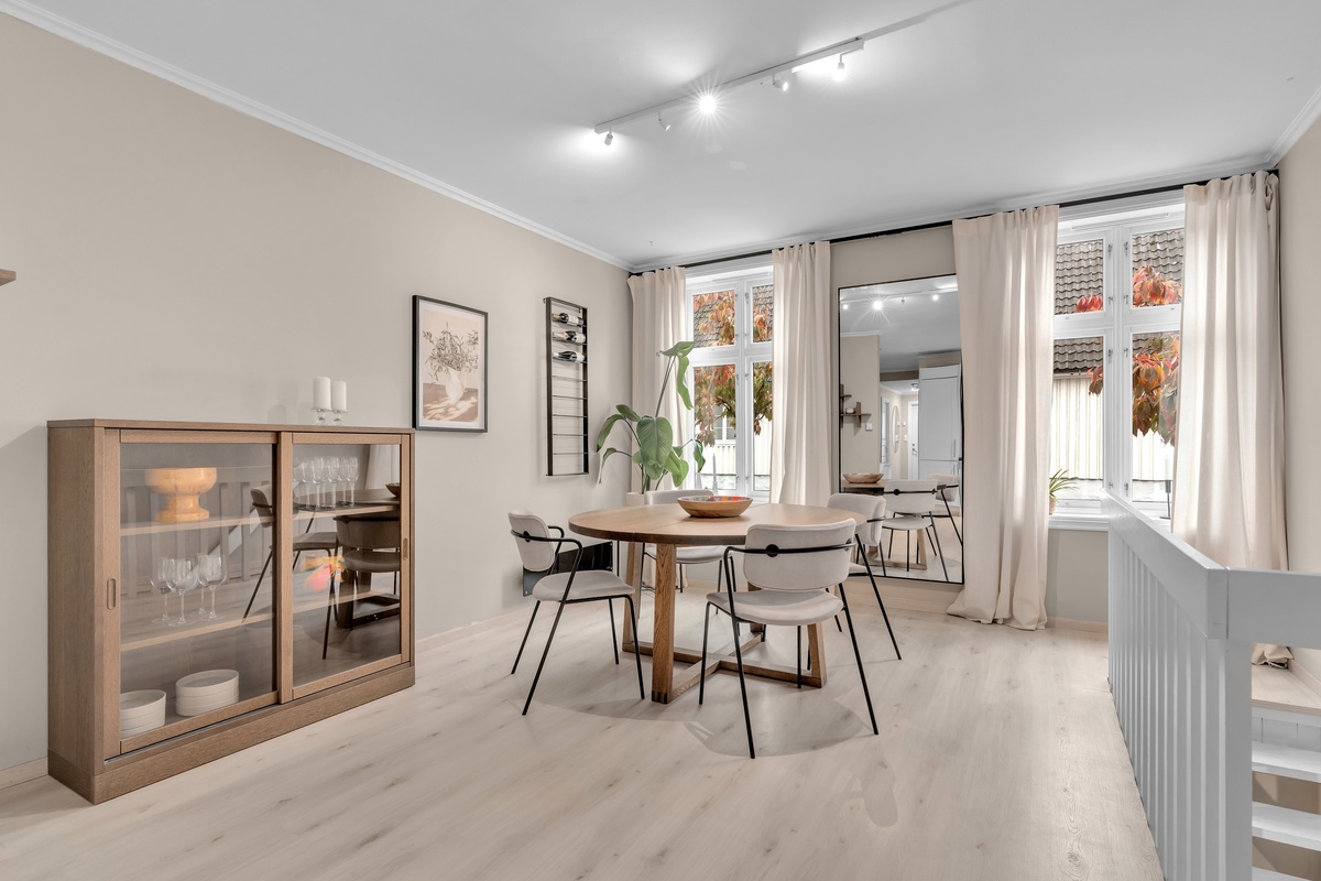 Lys og romslig to etasjers leilighet med 2 store soverom, 2 bad og 2 stuer leies ut møblert.