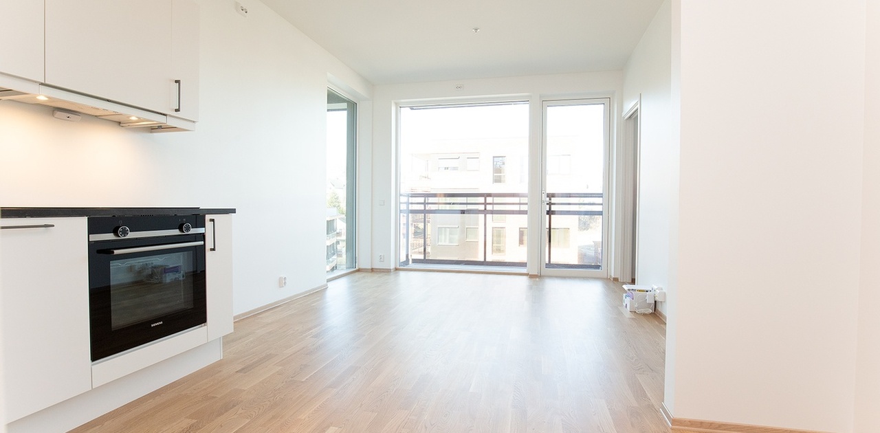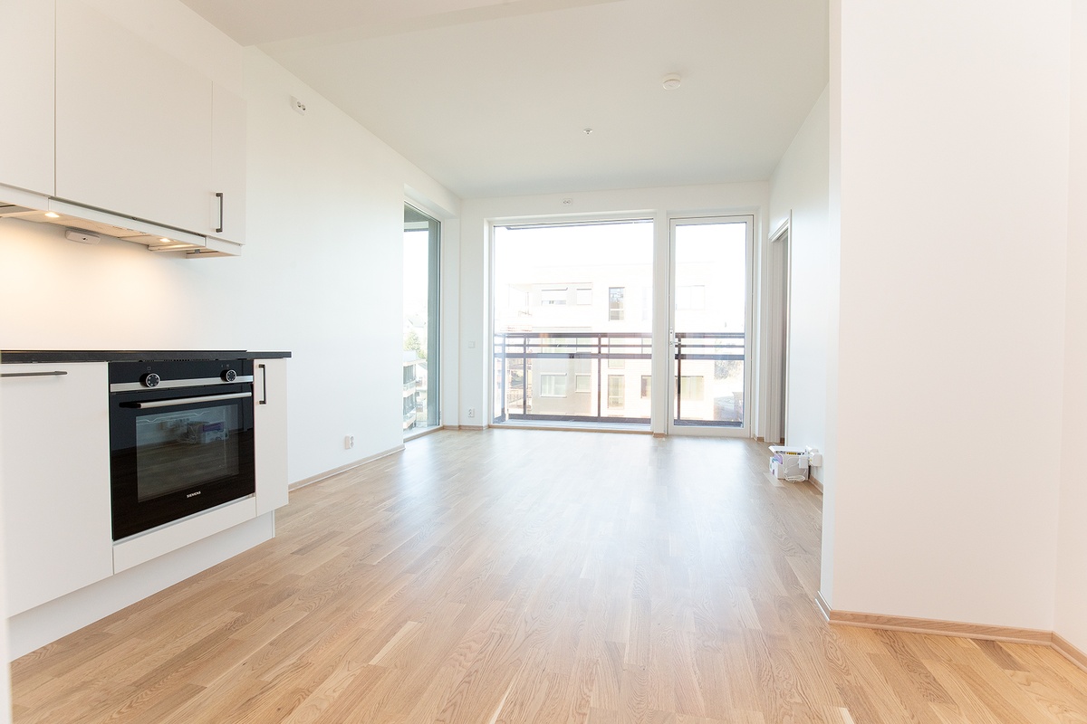 Leies ut umøblert, kun med intergrerte hvitevarer på kjøkken.