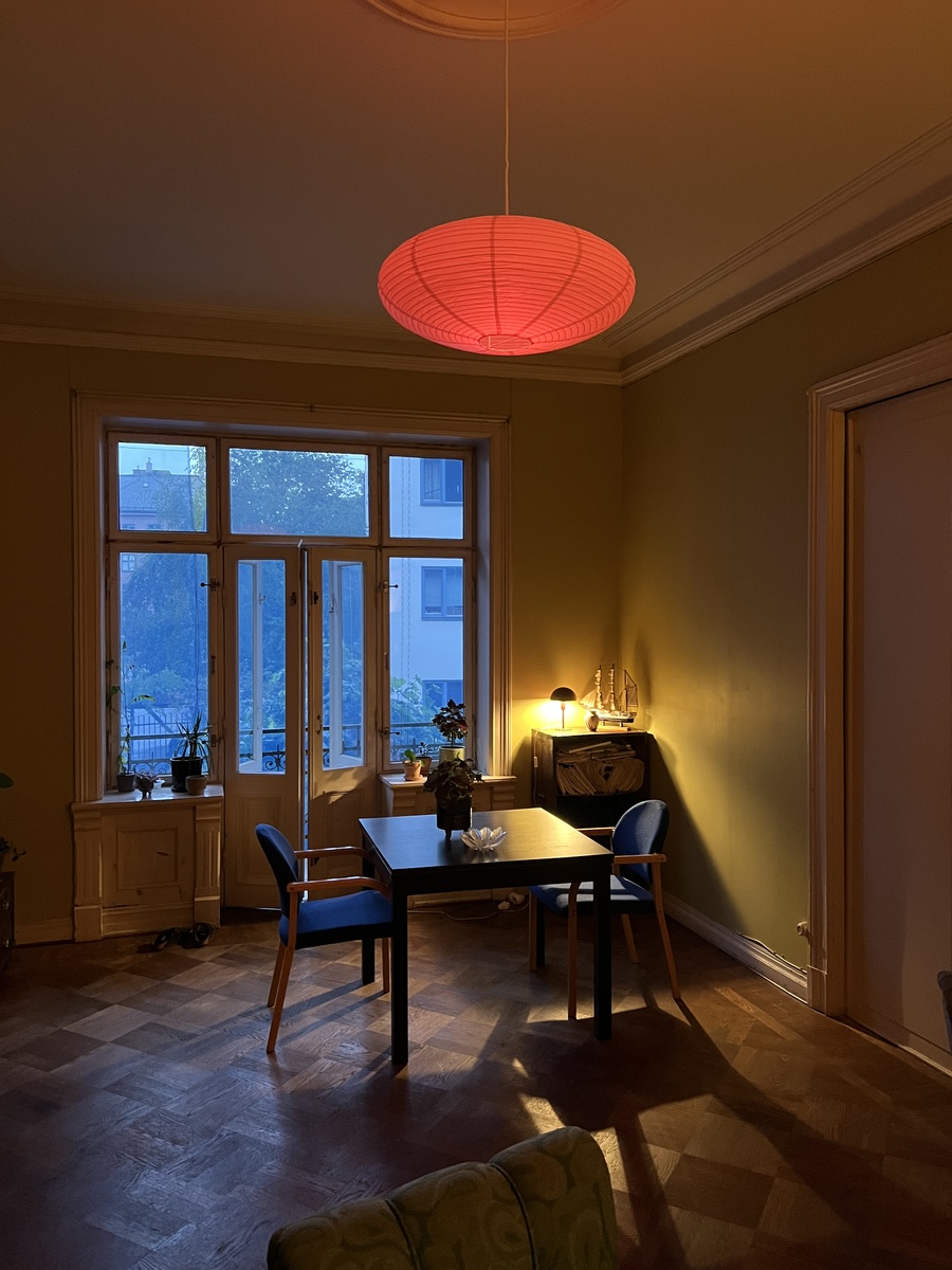 Dekoren er en blanding av farger, mønstre og tapeter, som gir en sjarmerende og unik stil. Utsikten er mot den franske skolen – og med franske naboer, fransk taco og en fransk café i nærheten, føles det nesten som å bo i Paris 😉
