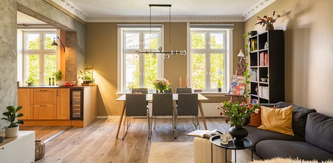 Leiligheten byr på god takhøyde, store vinduer som slipper inn rikelig med dagslys, og originale detaljer som gir hjemmet en særpreget og innbydende atmosfære.