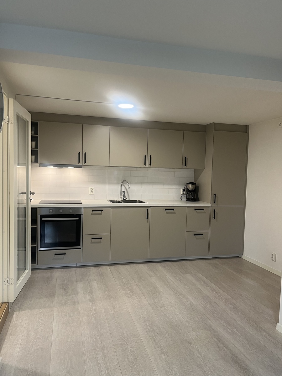 Leiligheten ble bygget i 2024, med nytt kjøkken fra IKEA og helfliset bad med varmekabler. Hele leiligheten er i moderne stil, med laminat i grå/beige toner, og hvite vegger.