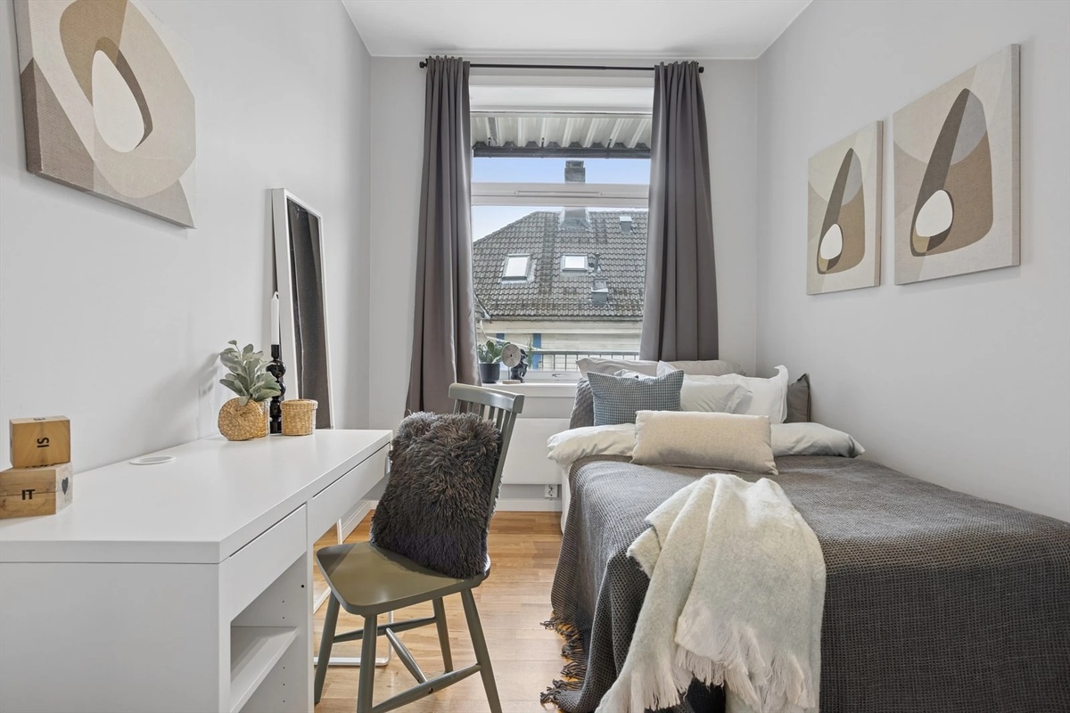 Rom på 9,4 m² leies ut i en moderne og hyggelig leilighet med god standard. Rommet er møblert med stor pult, klesskap og en 150 cm seng – perfekt for studier og avslapping.
