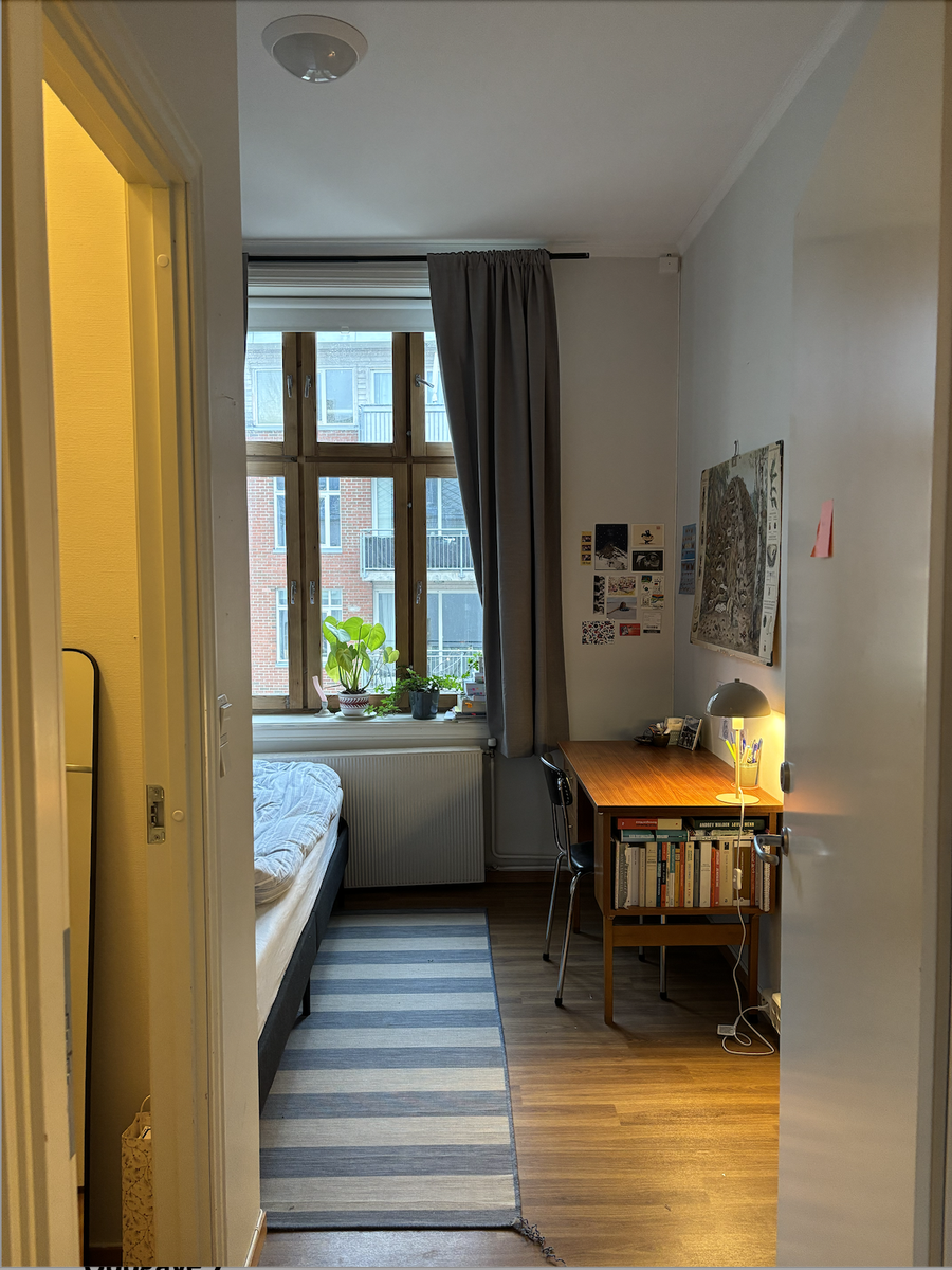 Rommet er 12.5 kvadratmeter med walk-in-closet! Det er høyt under tak, og både seng, skrivepult og kommode følger med under fremleie-perioden.