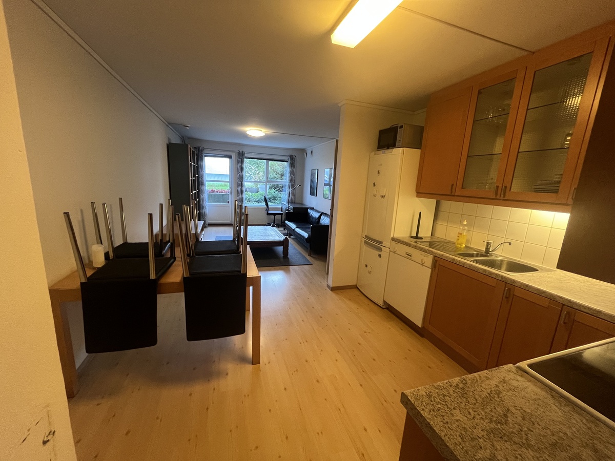 Kjøkken med kjøkkenredskaper, komfyr, kombiskap og oppvaskmaskin. Spisebord med stoler. Stue med sofa, skrivebord, TV-bord og bokhyllle.