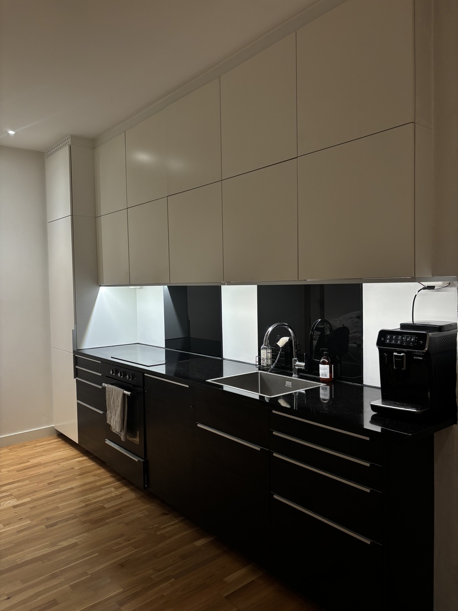 På bildene ser leiligheten noe mørk ut, da disse er tatt på kvelden. Men leiligheten er lys og fin, med morgen- og dagslys inn vinduene avbildet i stuen og på soverommet.