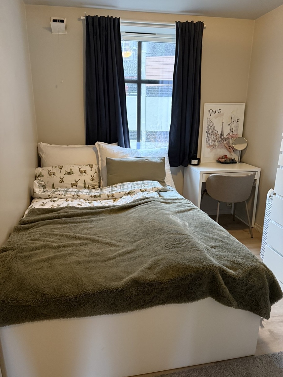 Jeg skal på utveksling og fremleier derfor rommet mitt i et koselig jentekollektiv, fra januar til sommeren 2026. Det leies ut møblert og det er tilgang på bod, hvis det skulle vært nødvendig. Leiligheten ligger sentralt på Danmarksplass. Kun 5 min å gå til bybanestopp og flere busstopp i nærheten. Kort gange til Hvl, UiB og BI. Ser etter en rolig og sosial jente i 20-årene til å overta. Du vil bo med en annen, Maren, som studerer 2.året juss på UiB.