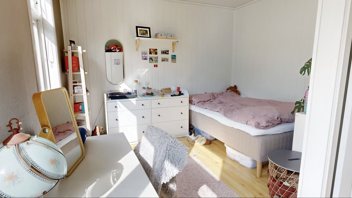 Rommet som leies ut er på 12 kvm, der skap medfølger og flere møbler kan kjøpes med (rommet er møblert annerledes i dag).