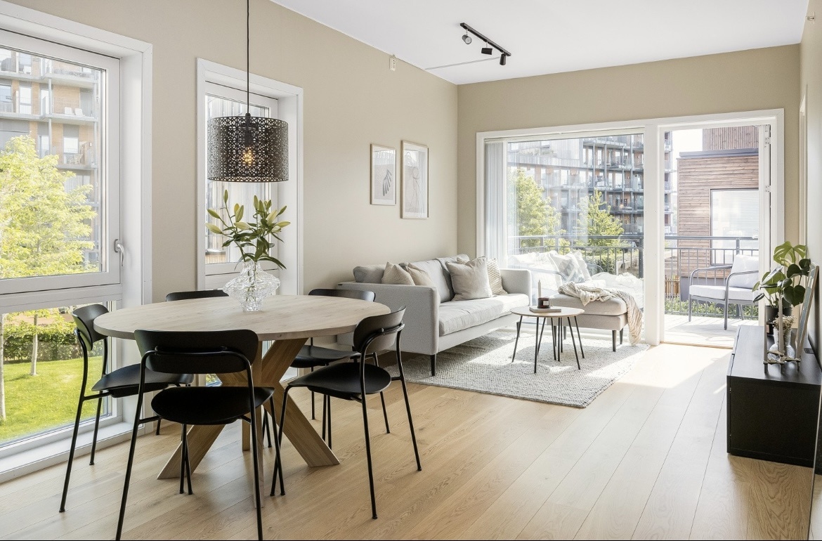 Boligen er godt opplyst av naturlig lys som slippes inn gjennom de store vindusflatene. Stue og oppholdsareal har god plass til både sofa-løsning og spisebord. Det moderne kjøkkenet er utstyrt med stekeovn, induksjonstopp, oppvaskmaskin og kjøleskap, som følger med i leien. Vaskemaskin følger også med. Hele leiligheten er oppvarmet av vannbåren gulv-varme (fjernvarme), som medfører meget lave strømutgifter.