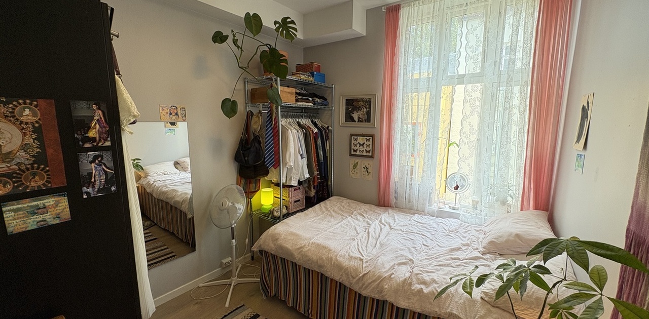 Soverommet er på ca. 9 kvm. Sengen på bildet er 120 x 200 (kan overtas av ny leieboer), men plass til større. Vindu mot bakgård. Stort klesskap følger med.