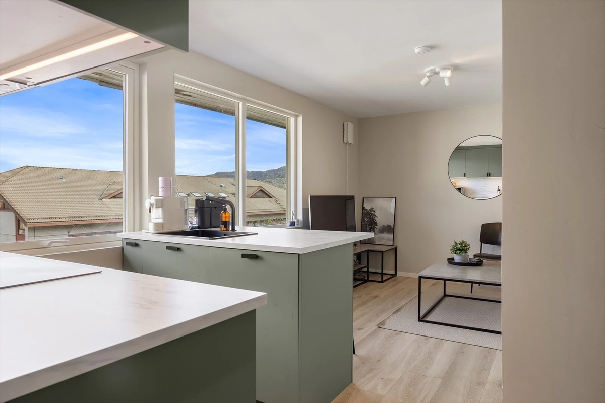 Leiligheten er en flott 4-roms på ca. 70 kvm som ble totalrenovert i 2022-2023, med gjennomgående pen og moderne standard. Det er totalt 3 soverom – nå er ett rom ledig. De to andre beboerne har bodd der lenger enn eier av huset, studerer i sentrum og jobber ved siden av. Husleien er satt til 6.200,- i mnd. som anses som rimelig (gjengs leie er estimert til 7.000+ UTEN fiberbredbånd, som er inkludert her!).