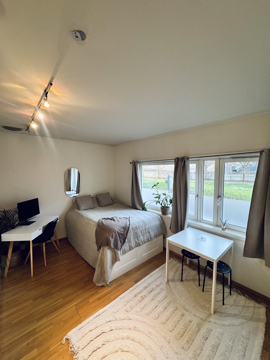 Leiligheten har for eksempel plass til dobbeltseng, kontorpult og spisebord (andre løsninger er også mulige).
