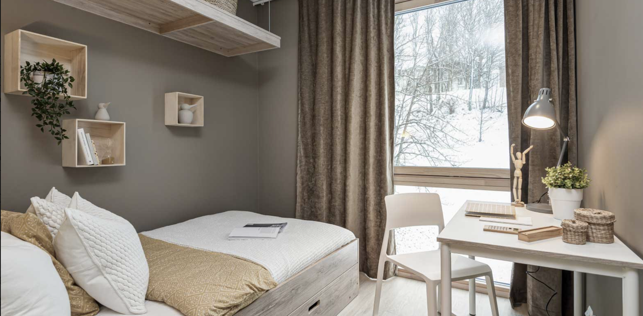 - Hylle over seng med lys- Egen sportsbod og innendørs sykkelparkering er inkludert