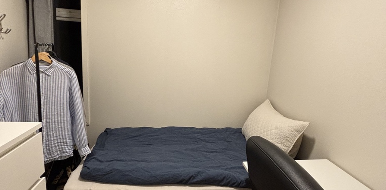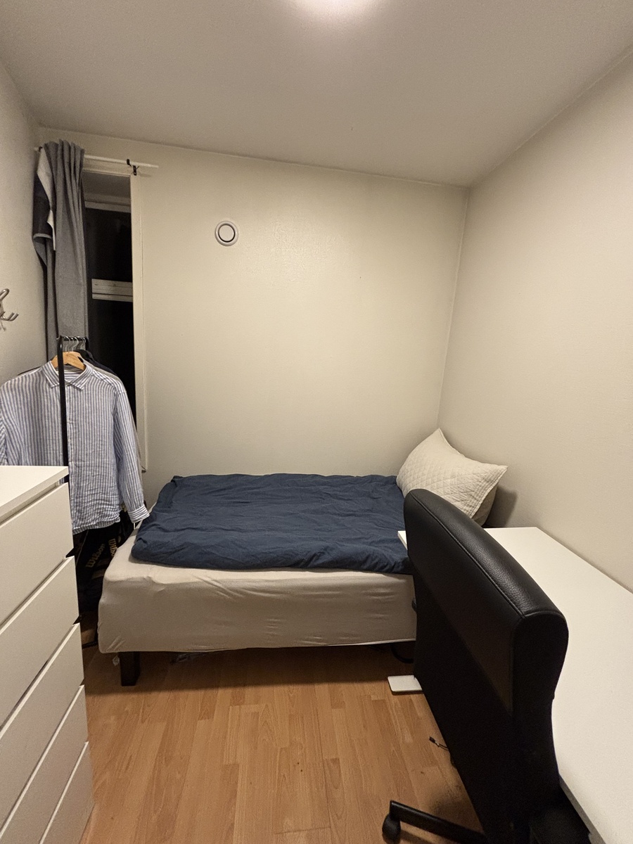 Rommet er møblert og inkluderer seng, skrivebord, stol og kommode. Det passer perfekt for en student eller ung arbeidstaker som ønsker å bo komfortabelt og svært sentralt. Det leies også ut et annet rom i samme kollektiv dersom to personer ønsker å flytte inn samtidig.