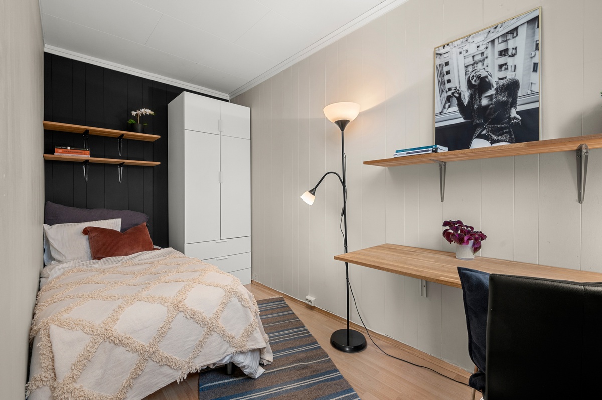 Utmerket plassert hybelleilighet med ypperlig beliggenhet rett ved NTNU Gløshaugen. Boligen er av god standard, pent møblert og inneholder tre soverom. Ett av rommene er leid ut til en gutt på 27 (Masterstudent). Ett til en PhD student. Siste soverommene er på 7.6 (soverom 1). Soverommet er møblert med seng, klesskap og skrivepult med en stol. Kjøkkenet er utstyrt med et kombinert kjøleskap/fryser og oppvaskmaskin. Videre inkluderer leiligheten både vaskemaskin, tørketrommel og to boder.