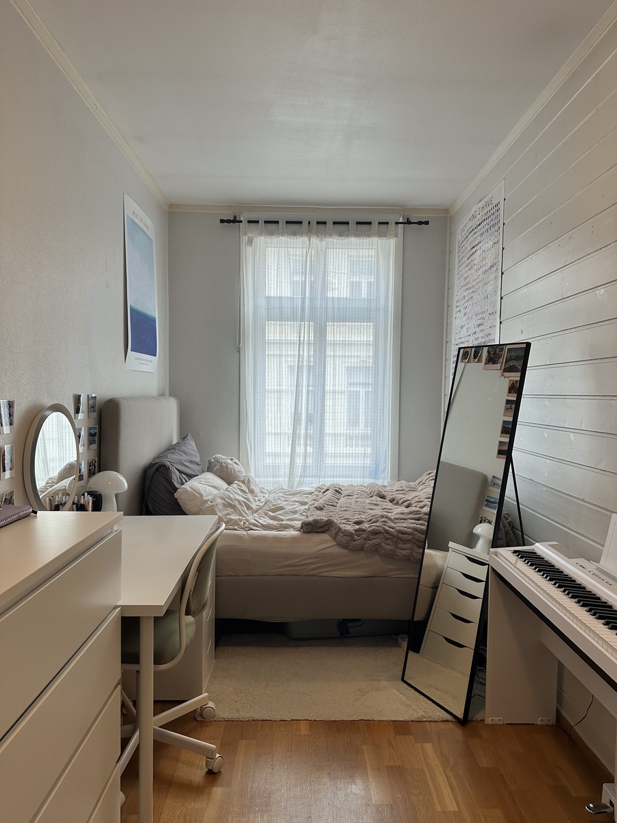 Rommet som leies ut ligger på ca. 11 kvm, med stort vindu ut mot gaten. Rommet vil være delvis møblert med seng, pult, skap, kommode og bokhylle. Det vil også være mulighet for at enkelte andre møbler også kan følge med dersom leietaker ønsker dette.