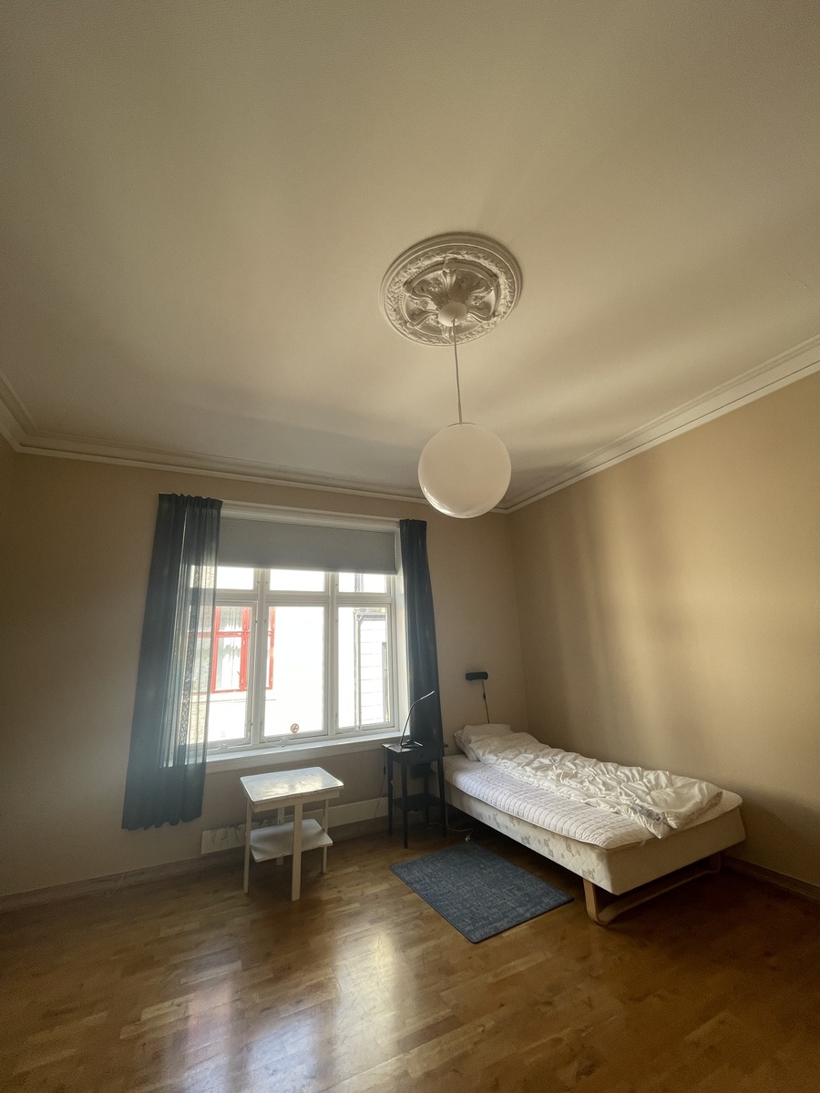 A spacious room of approx. 25 m² is available from January 1st in a traditional townhouse located in Nygårdsgaten 2a. The building consists of rooms, apartments, offices, and commercial spaces, and is centrally located with short walking distance to UiB, public transport, grocery stores and shops.