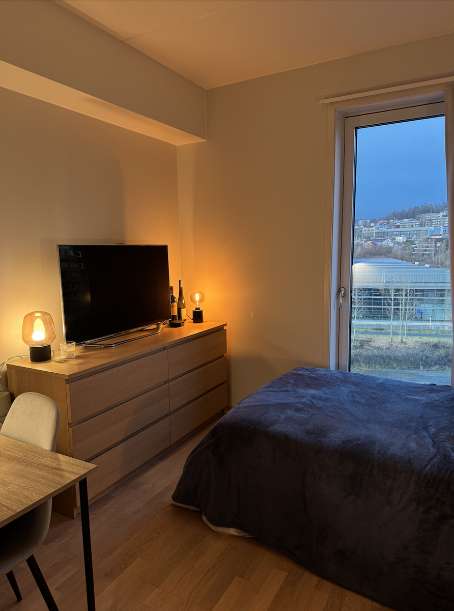 Klesskap følger med rommet. Kommode kan kjøpes ved ønske.