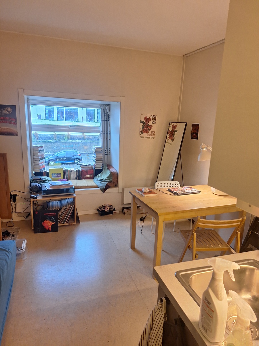 Hybelen er på ett rom, med eget kjøkken og bad, og leies ut til en ganske billig penge. Den kommer til å stå tom fra rundt 17. desember et sted, men regner med at mange kommer til å ønske å leie fra litt nærmere semesterstart og det er selvsagt mulig. Elektrisitet, vann, internett og varme er alt inkludert i prisen.