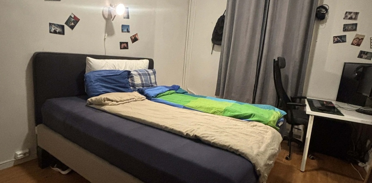 Soverommet som er ledig er 12 kvm, med god plass. Det har stått ei 160cm seng og 130cm skrivepult. Dette, i tillegg til hylle kan kjøpast av han som flyttar. Utover dette har soverommet garderobeskap, som følger med, og radiator.