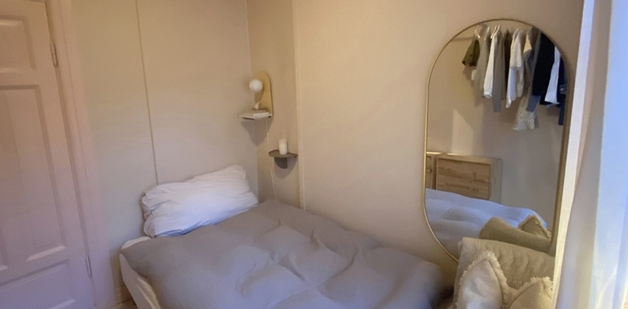 Rommet er lyst, pent og veldig rolig, med utsikt mot en fin og skjermet bakgård. Det leies ut møblert med seng og speil, og du får i tillegg et ekstra skap til oppbevaring ute i gangen. Det er derfor god plass til eiendelene dine selv om rommet er kompakt.