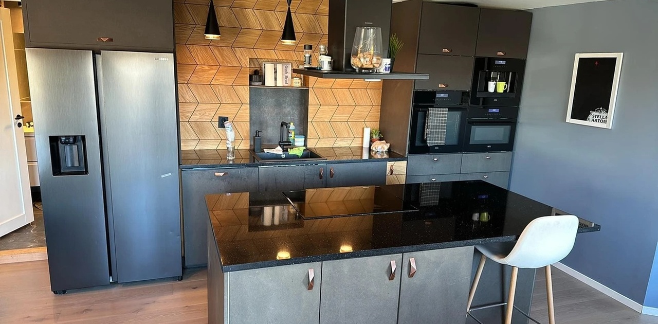 2 soverom og åpen kjøkkenløsning i stue med en sosial kjøkkenøy.