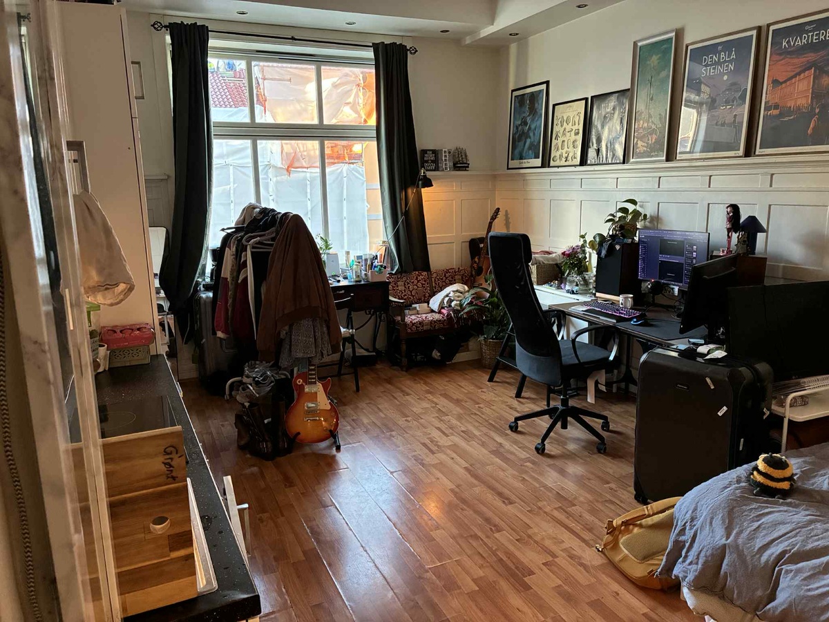 Leiligheten er på ett rom med eget kjøkken og man deler bad med 3 andre hybler. Det er felles vaskeri i kjelleren. Takhøyden i leiligheten er 3,40 meter som gjør leiligheten enda mer romslig. Møbler som følger med er en seng på 140 cm og pc-pulten. Andre møbler som kleshylle og henger kan også bli igjen om det er ønskelig. Det er ikke egen strømmåler for leiligheten, så det fordeles på areal og om man har eget bad eller ikke, noe som gjør strømkostnadene lave.