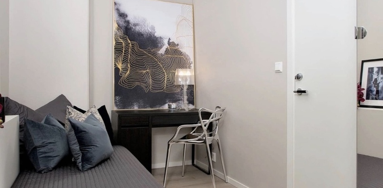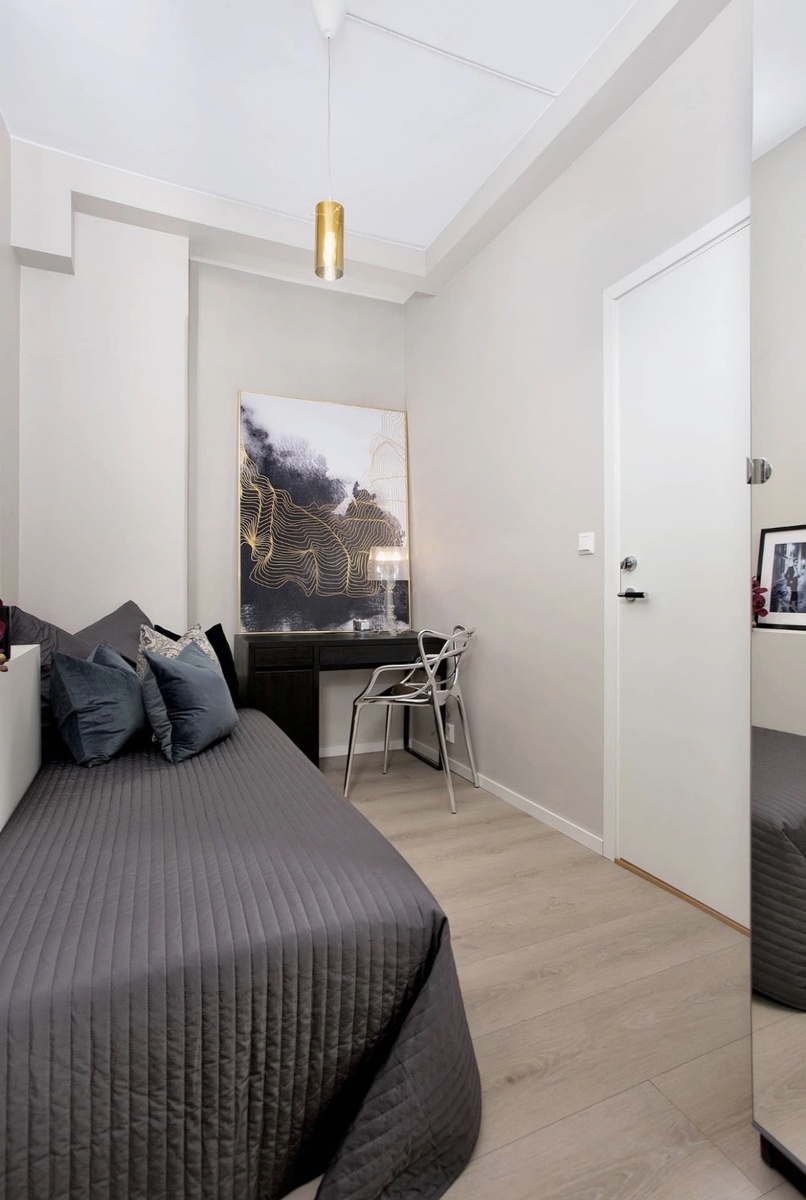 Rommet som leies ut er lyst og vender ut mot en stille bakgård - helt skjermet fra trafikk og støy. Det er ca. 8 kvm og høyt under taket. Rommet er møblert med seng (90x200), pult og klesskap med speil.