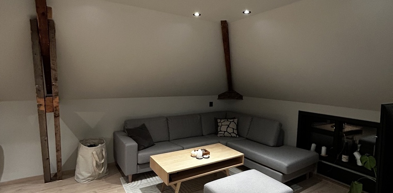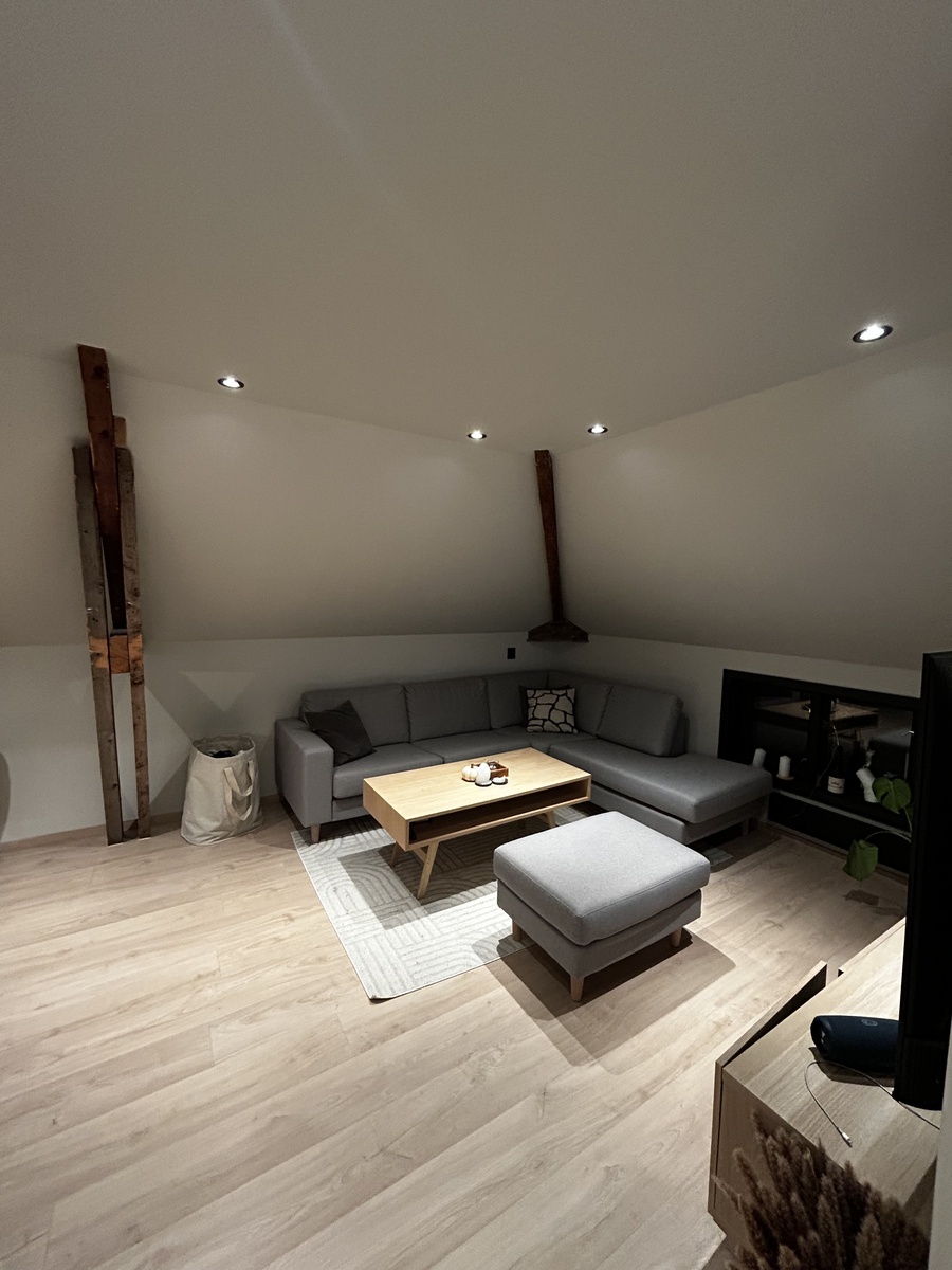 Stuen er møblert med sofa, bord og TV. også nyoppusset.