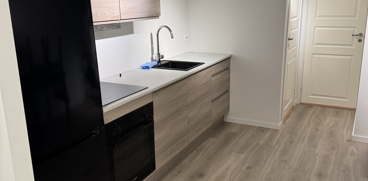 Stue/kjøkken: Alt er splitter nytt – nytt kjøkken med integrerte hvitevarer, nye gulv og nymalte vegger.