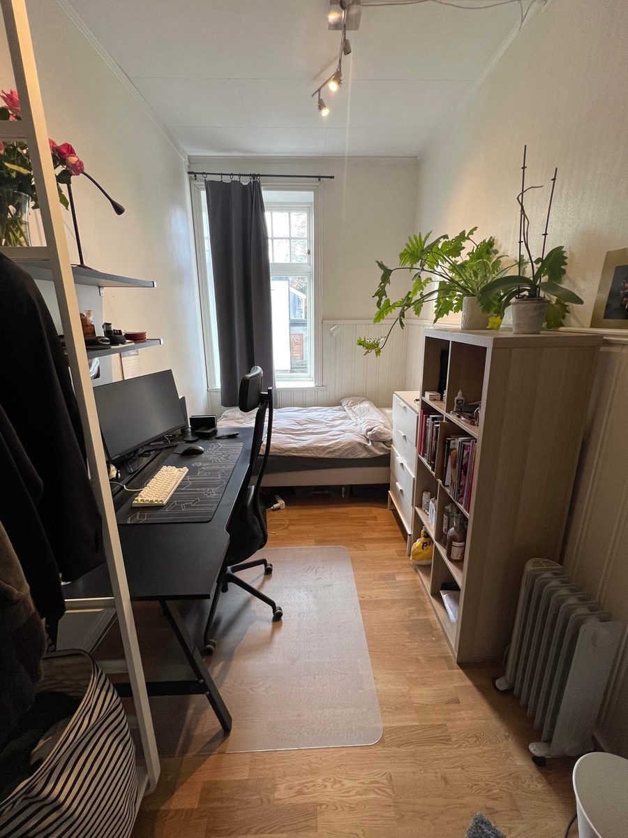 Fra nyttår drar jeg på utveksling, og leter derfor etter en ny person som kan ta over rommet mitt i kollektivet fra 1. januar 2025 til juni eller juli. Rommet er litt over 9 m² (2,13 x 4,3 m), og leies ut fullt møblert, med seng, skrivepult, klesstativ og skuffer. Møblene på bildet er litt annerledes enn de som er der nå, men standarden er tilsvarende og alt er i god stand.