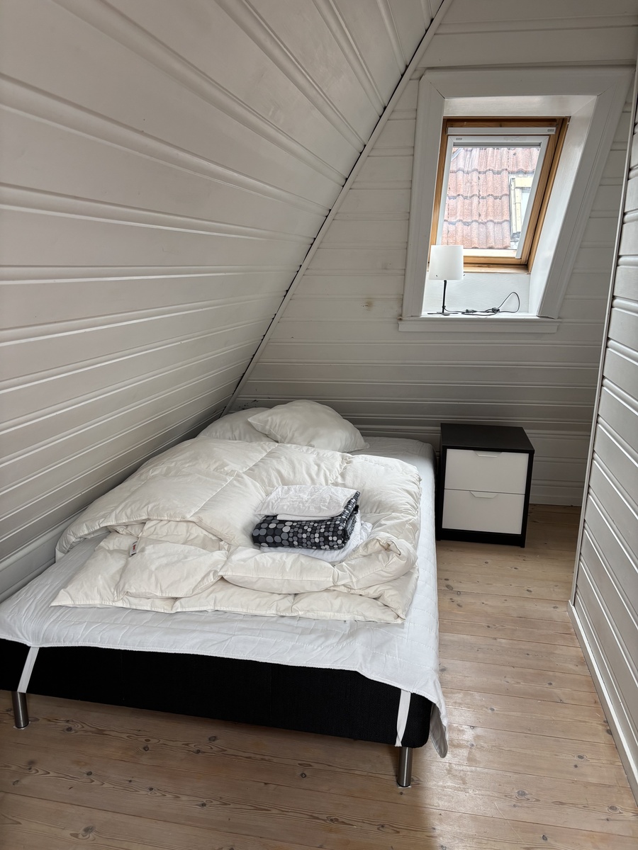 Mitt rom ligger under taket i 3.etasje og badet deles bare med 1 annen. På det andre badet (nede) har vi vaskemaskin og tørketrommel. I tillegg er det fint og stort kjøkken og en liten stue som fellesareal!