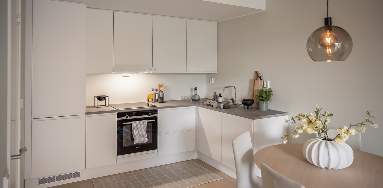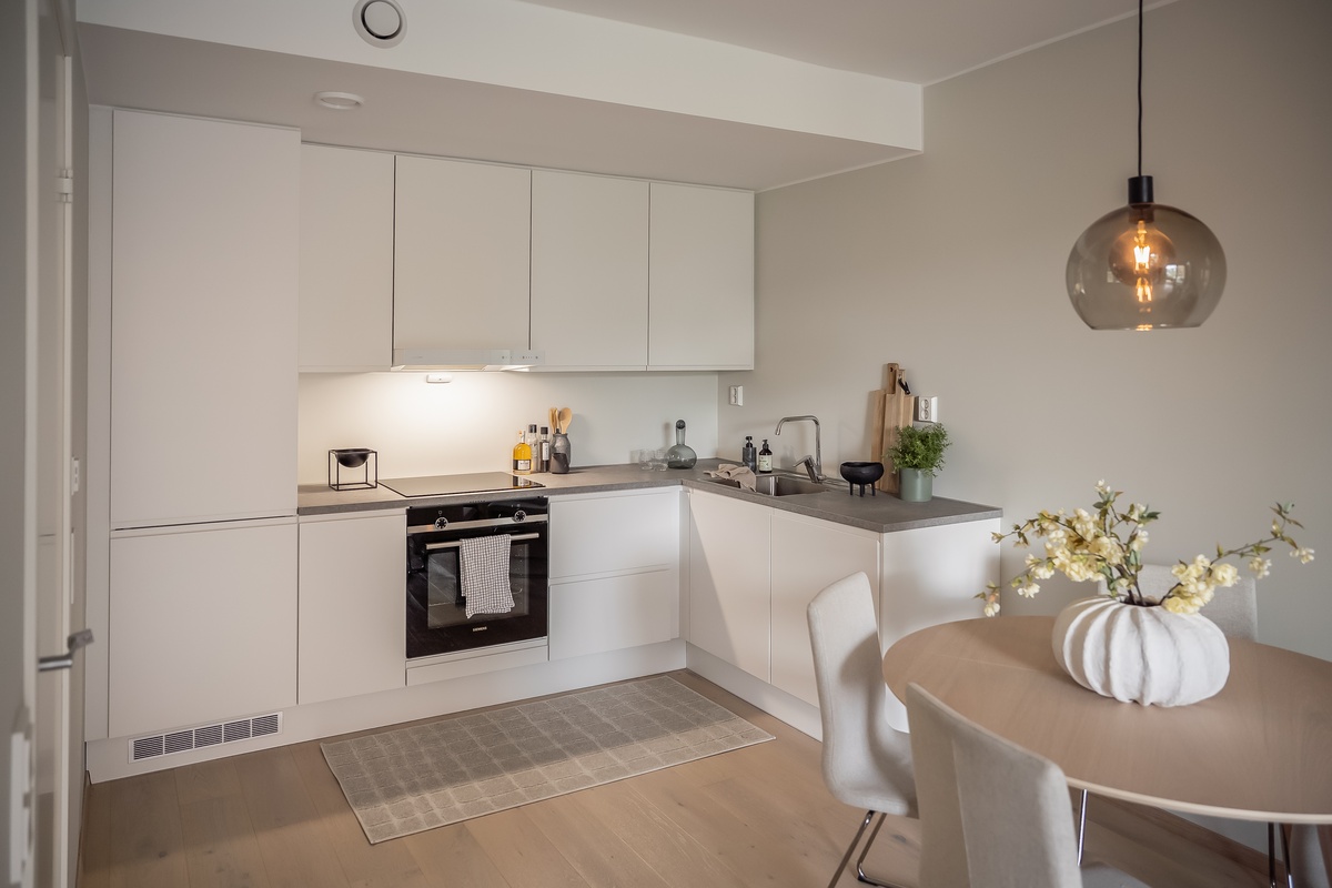Leiligheten holder en moderne standard med parkett, balansert ventilasjon og energieffektive løsninger. Den åpne planløsningen mellom stue og kjøkken gir en romslig og lys atmosfære. Kjøkkenet har integrerte hvitevarer, og fra stuen er det utgang til en romslig terrasse hvor du kan nyte rolige morgener og sene kvelder.