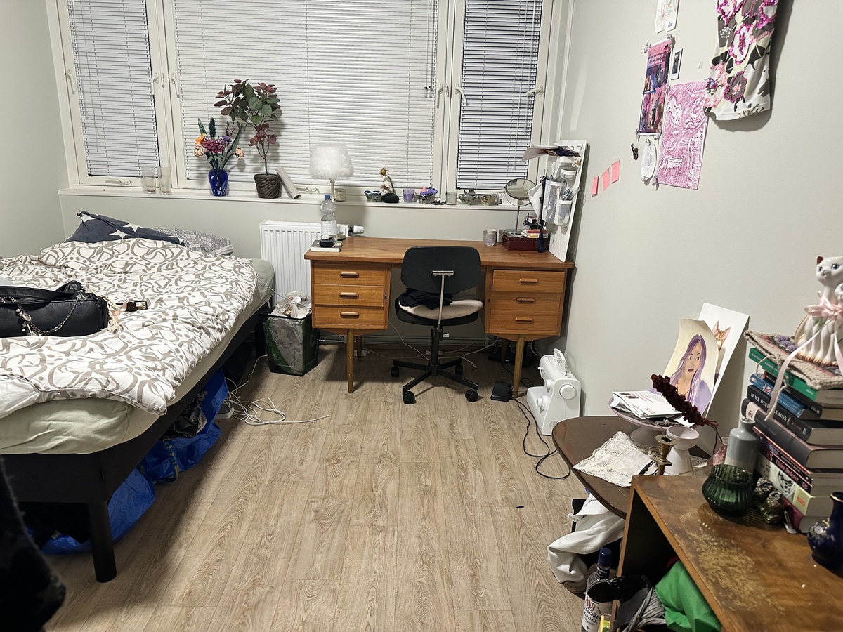 Hei! jeg framleier hybelen min ettersom jeg skal på utveksling. den har eget bad men delt kjøkken med 8 personer. hybelen ligger i Kringsjå studentby, med kort vei til Sognsvann, butikk og t-banen.