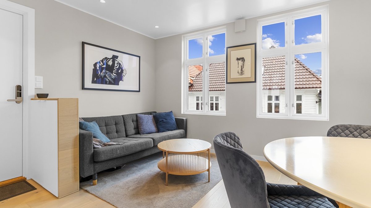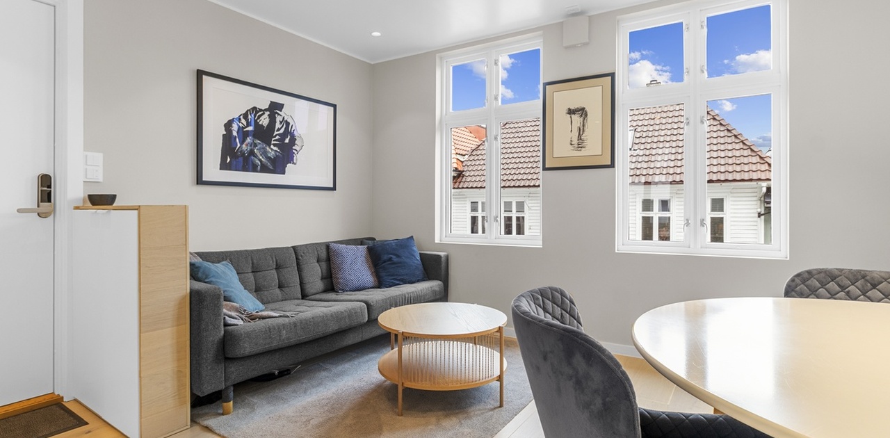 Leiligheten ligger i 2. etasje i en rolig blindgate, ideelt for rolige netter, og samtidig nærme byens liv.