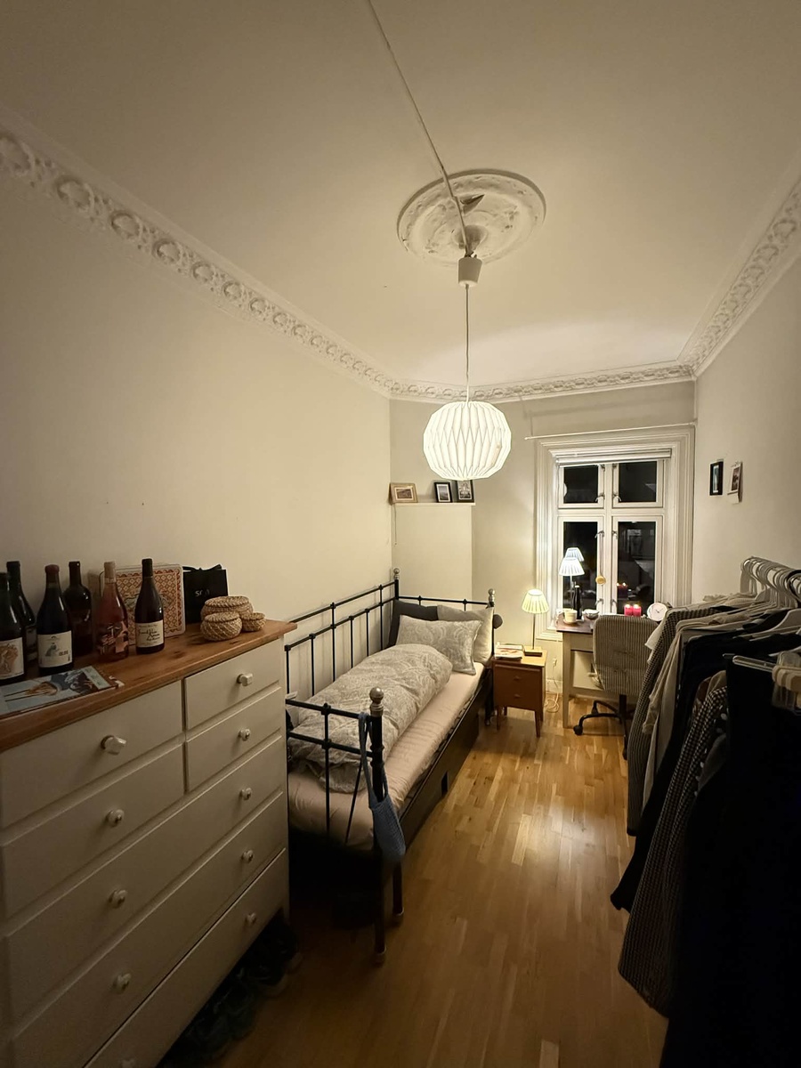 Rommet er lyst og har god plass til seng, garderobe og skrivebord. Det er utsikt mot en stille bakgård. Rommet leies ut umøblert, men mulighet for å overta noen møbler om ønskelig.