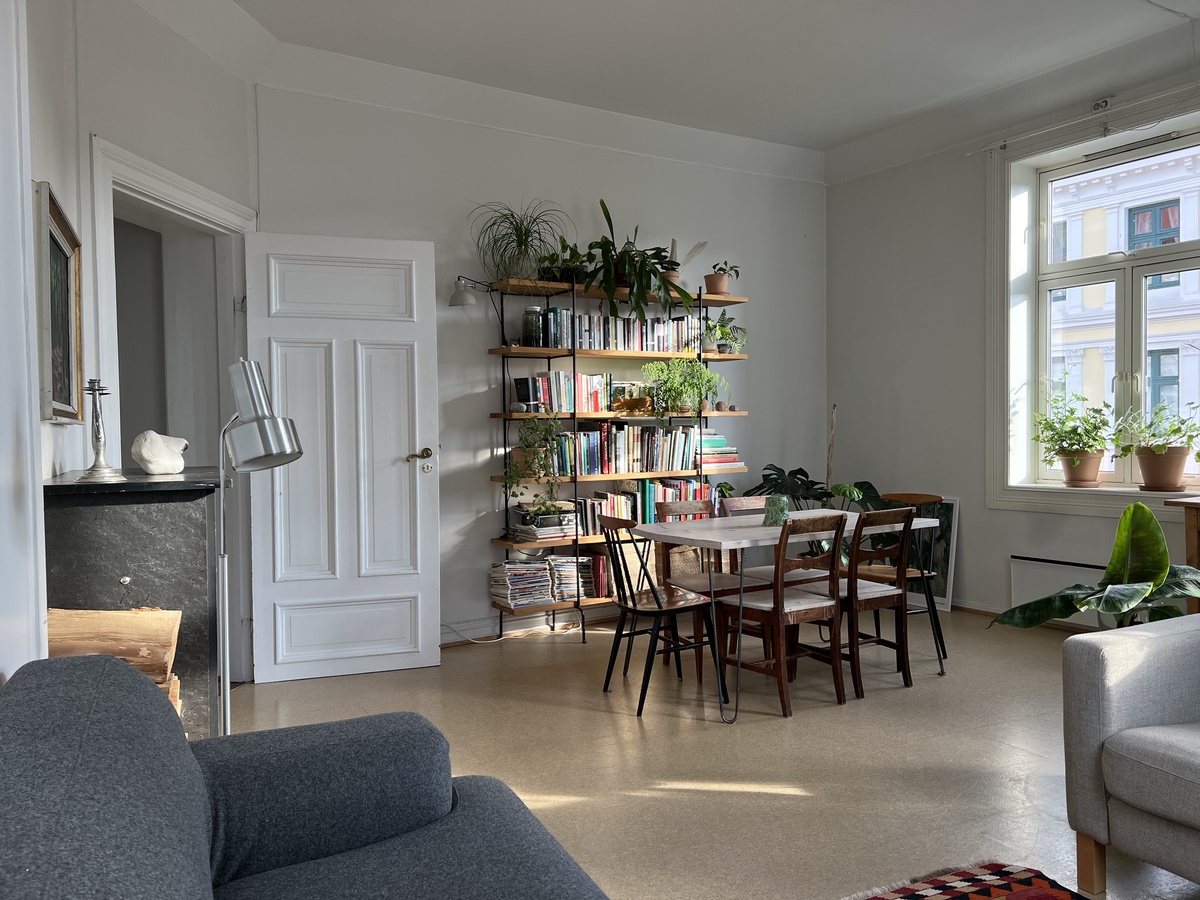 The apartment is very bright and sunny, with a south facing corner living room with three windows looking over Sørli plass, a quiet square where people sit with their children by the fountain. The living room is very spacious, with plants, books, nice furniture and a cosy fireplace. The bedroom is relatively small (11m2), but has two wardrobes, a chest of drawers, a double bed with a brand new mattress, and an armchair. There is a spacious, well equipped kitchen and one bathroom.