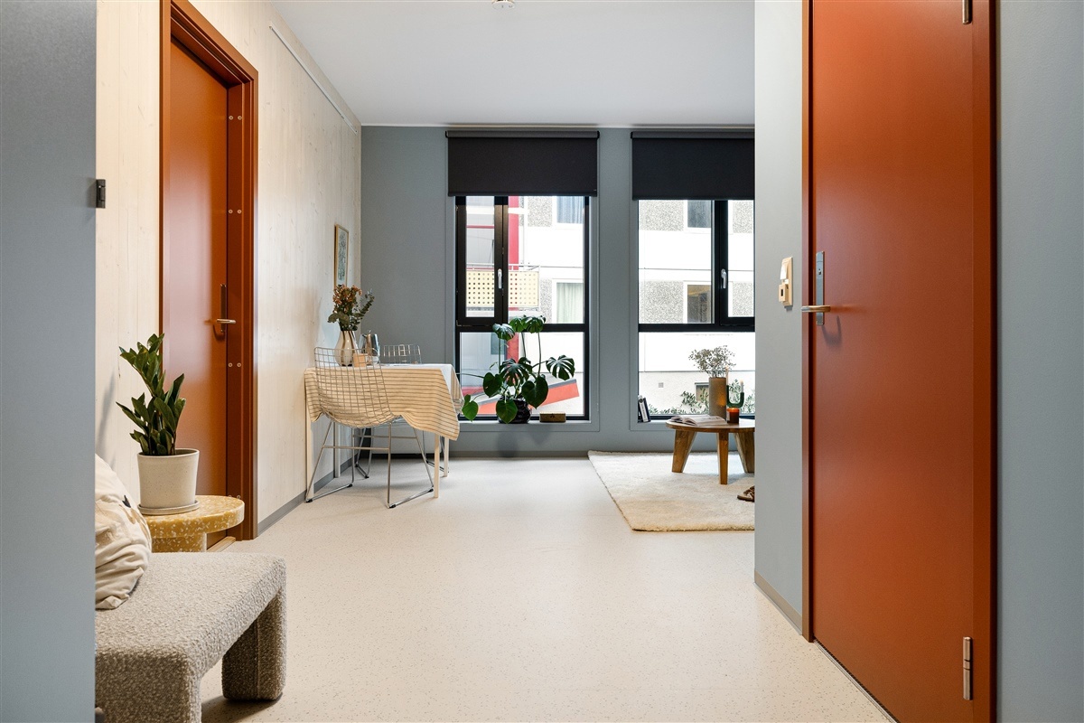 2-roms leilighet som inneholder et soverom og oppholdsrom. Leiligheten er møblert med dobbeltseng (2 rammemadrasser satt sammen – totalt 150x200), skrivebord med stol, gardiner/rullgardin og klesskap. Kan leies ut med sofa, sminkebord og bokhylle om ønsket.