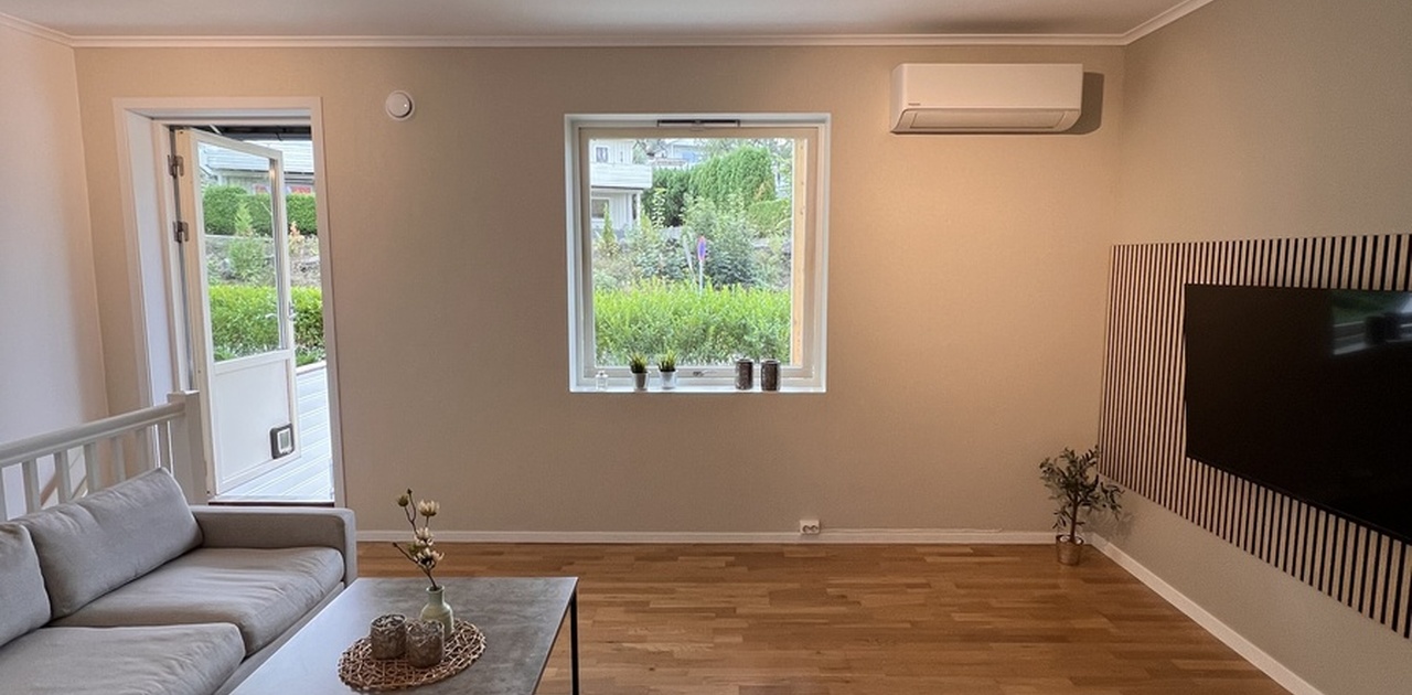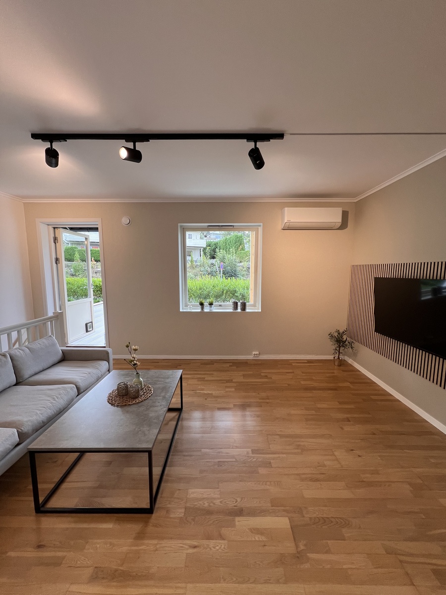 Her vil det følge med sofa, sofabord og splitter ny 55 tommers 4k tv. Det er også varmepumpe i stuen,