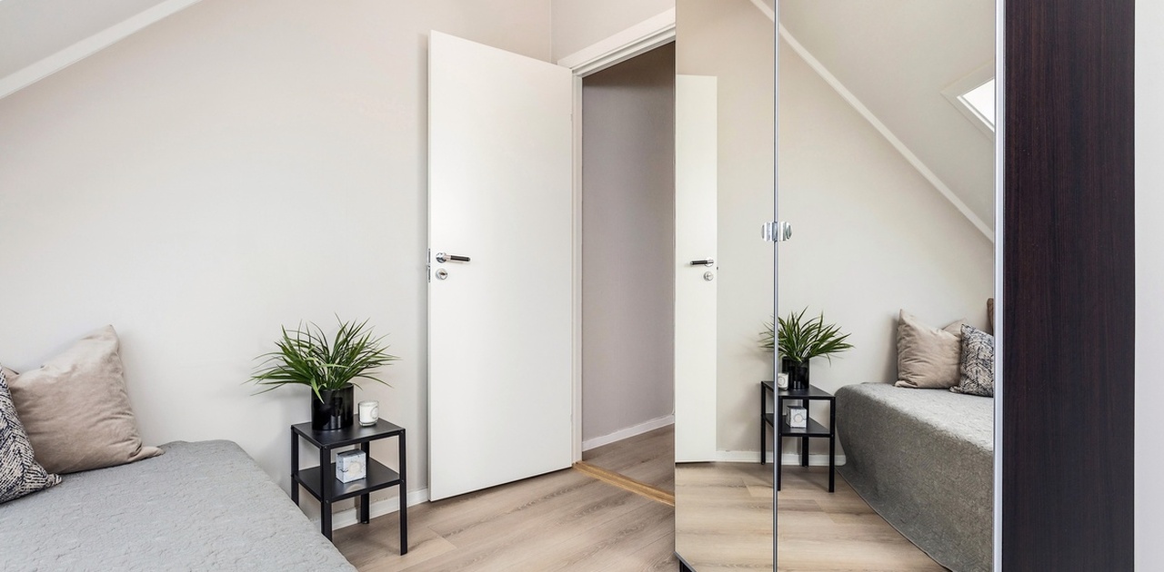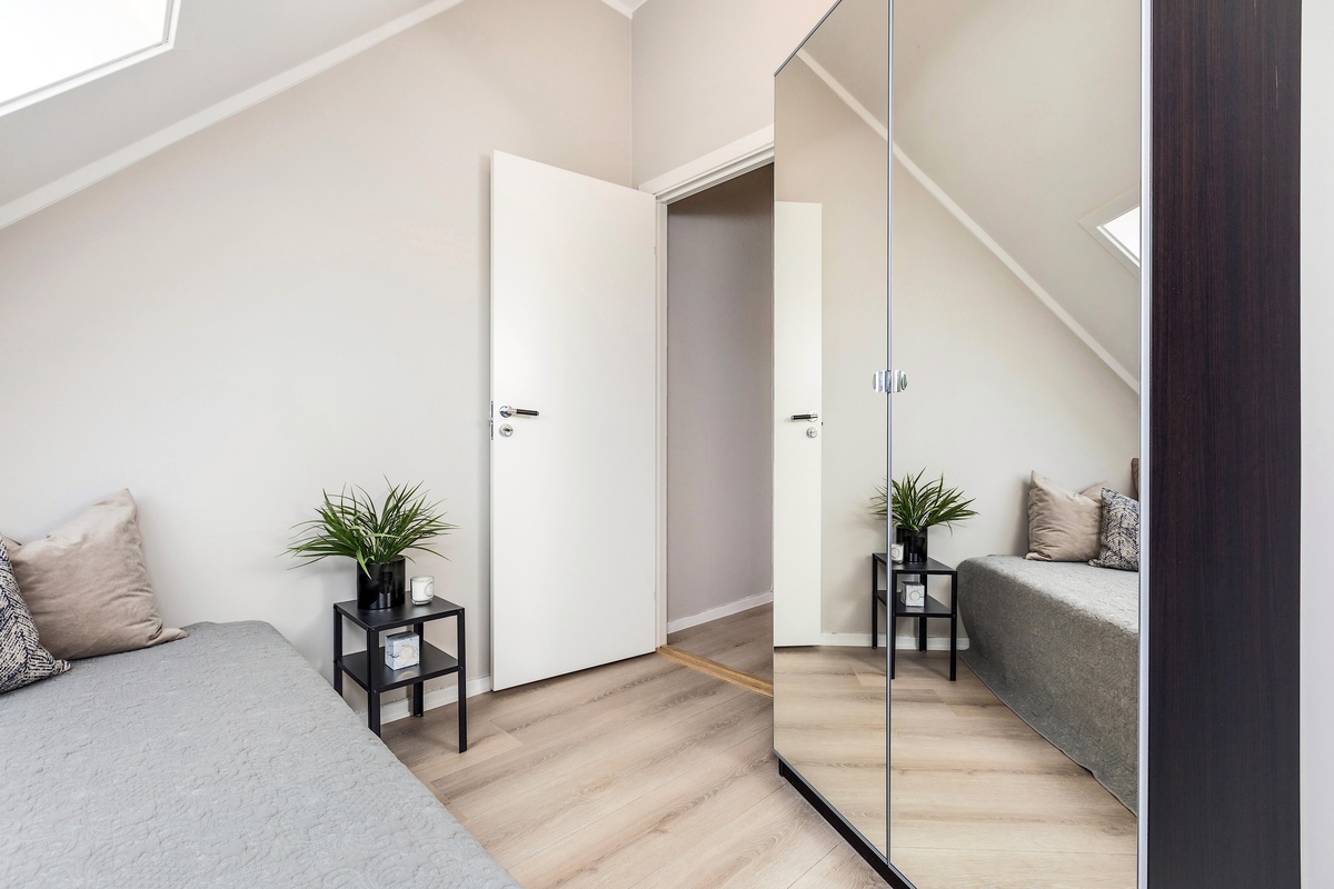 • Kommer med stort garderobeskap med speildører seng, nattbord og nattbordlampe.