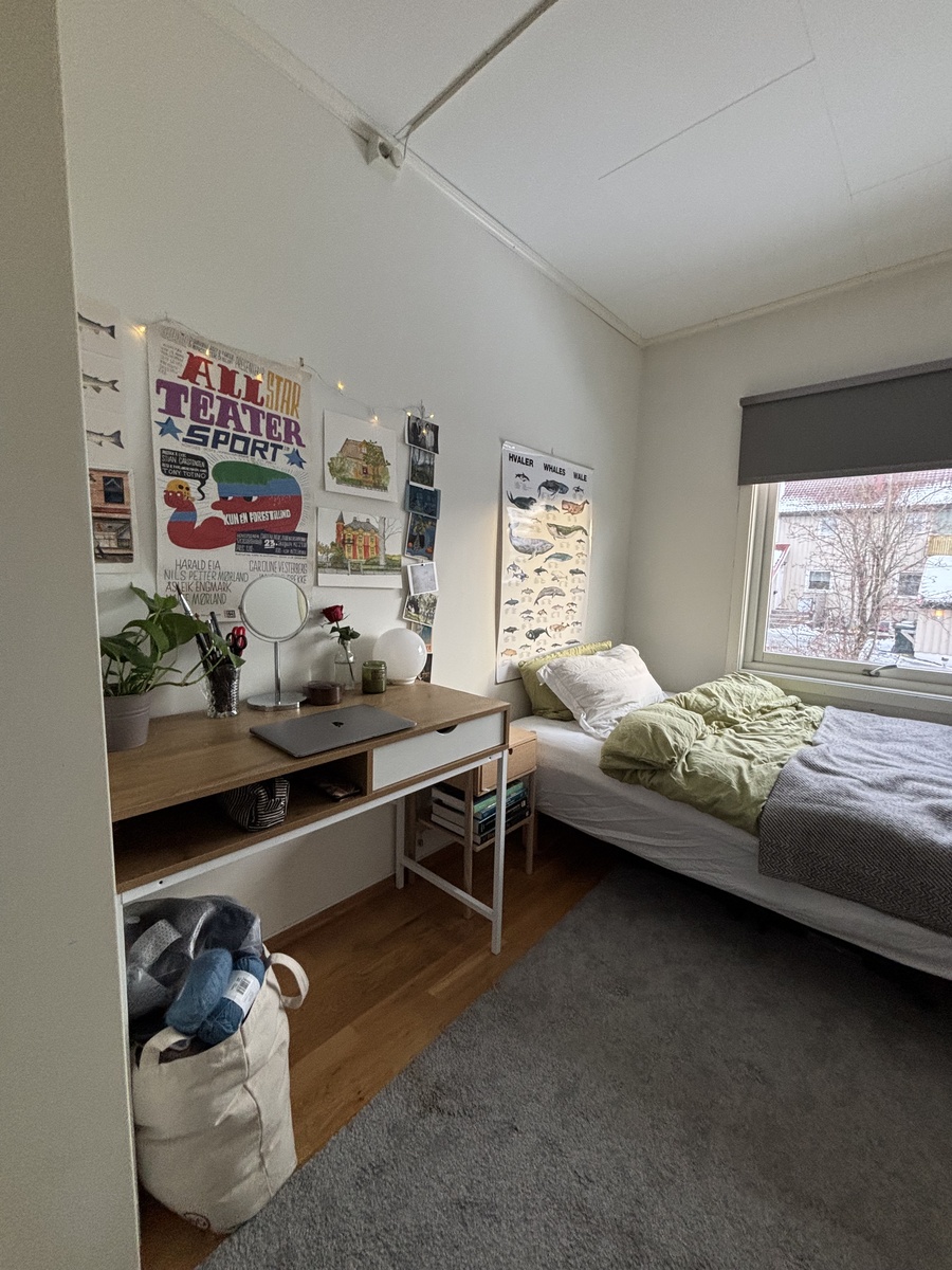 Jeg fremleier rommet mitt i et jentekollektiv på 3 stk fra 01.01. til 01.06. på grunn av utveksling☺️. Kollektivet består av to veldig hyggelige jenter Anette(24) og Guro(24) som begge er studenter. Rommet har en 120 seng og skap, pult og nattbord kan stå om ønskelig. Leiligheten har balkong, peisovn og grøntområde🌿. Huset ligger 5 min. unna Berg busstopp, 3 min. unna Dybdahls vei busstopp, og bare 15 minutters gåtur til Gløshaugen:)