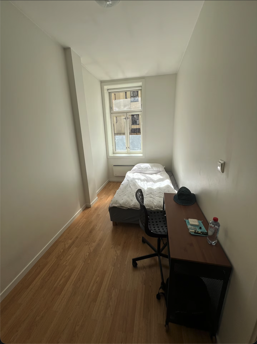 Leien på 10 000kr inkluderer strøm, oppvarming, varmtvann, og 100/100 fiber internett. 120cm seng, skrivebord og garderobeløsning følger med.