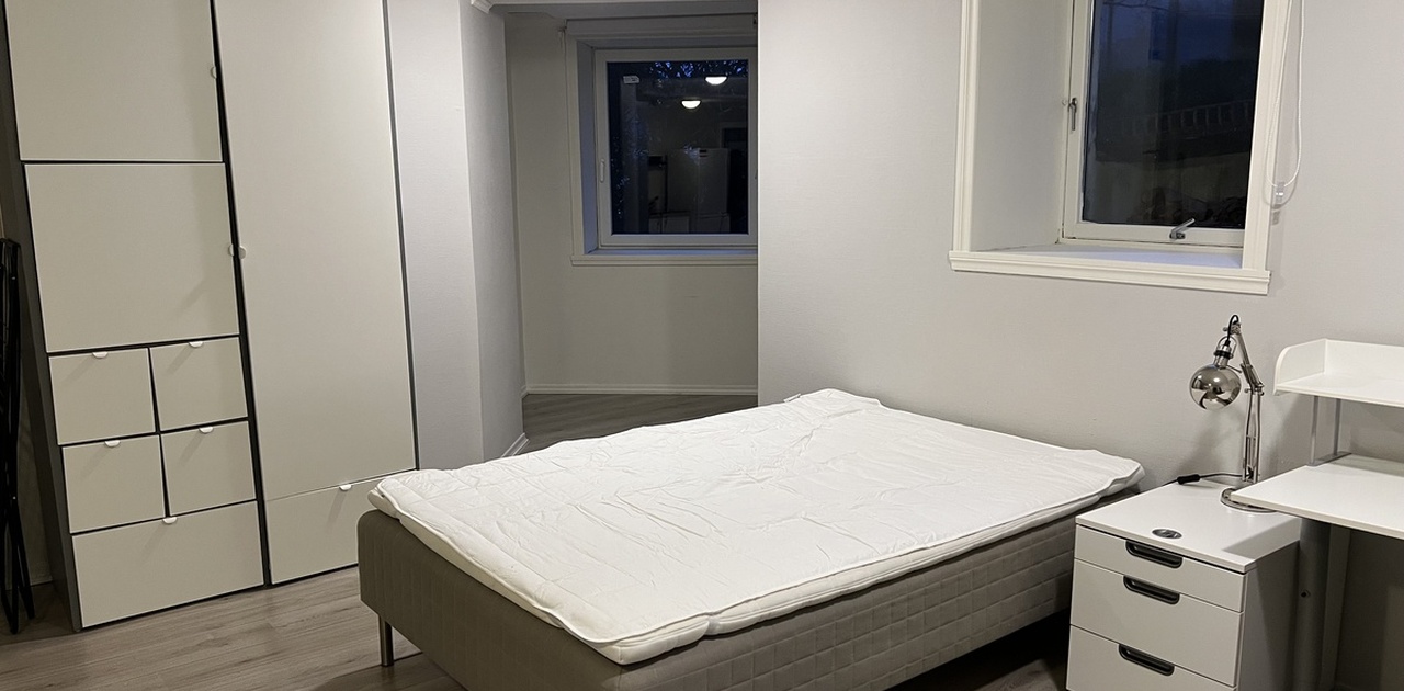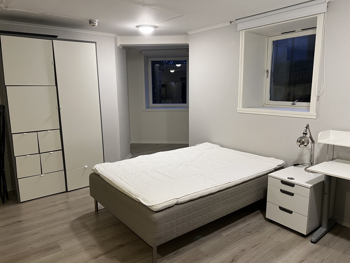 Huset har bofellesskap i 1. etg, og 6 rom i sokkel. Jeg ønsker å leie ut mitt rom i sokkel, ca 20 m2. Dette inneholder kjøkkenkrok med koketopp, vask, kjøleskap og mikro, samt seng, skap og pult. Du deler et bad med dusj og toalett, et enkelt toalett og vaskerom med de 5 andre rommene. Det er et sentralt men rolig og fint sted uten støy, samt gode bussforbindelser. De andre rommene er leid ut til 1 gutt og 4 jenter.