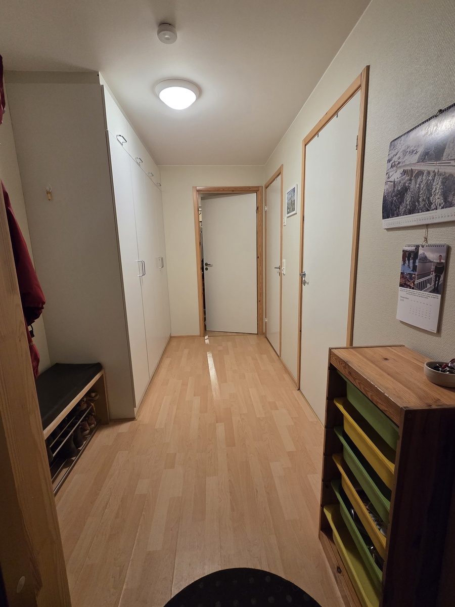 A neat and well-maintained apartment in a co-ownership building constructed in 2004 is available for new tenants. The apartment is centrally located in Moholt, right next to Moholt Studenby, a short distance from NTNU (Gløshaugen and Dragvoll) with excellent bus connections. The apartment has a living room/kitchen, bedroom, bathroom and hallway, with an additional 5 m² storage room in the basement (as well as common areas in the basement for bicycle storage during the winter). The apartment is equipped with all appliances (washing machine, tumble dryer, dishwasher, microwave, stove and refrigerator/freezer). The apartment has a balanced ventilation system with heat recovery, which keeps electricity consumption low while keeping the apartment warm. The co-ownership has a large parking area with parking for residents and guests. Common costs, internet access and cable TV are included in the co-ownership's common costs and are part of the rent.