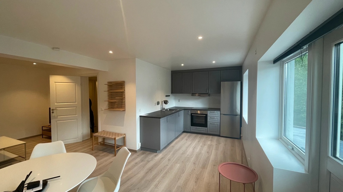 - Jeg har kjøpt en større seng og pult og stol som er satt inn på rommet som jeg kan eventuelt selge videre til deg om det skulle være ønskelig. Fra egne erfaringer er leiligheten perfekt lokalisert i forhold til avstand til butikk, treningssenter, bybane, buss osv. Så at leiligheten ikke er midt i sentrum er ikke et problem. Leiligheten er ganske stor så får en hus-aktig følelse og trenger ikke leve oppå de du bor med. Alle bildene er fra før vi flyttet inn så er en del ekstra ting kjøpt inn av oss som du slipper å tenke på som større spisebord, vannkoker, generelt ekstra ting til kjøkkenet(mer bestikk og tallerkner, mikro, ekstra stekepanne, beholdere til mat osv.), enda et internett(1 oppe og 1 nede) og enda mer. Zaid og Mads deler på bad nede, mens du får badet oppe.