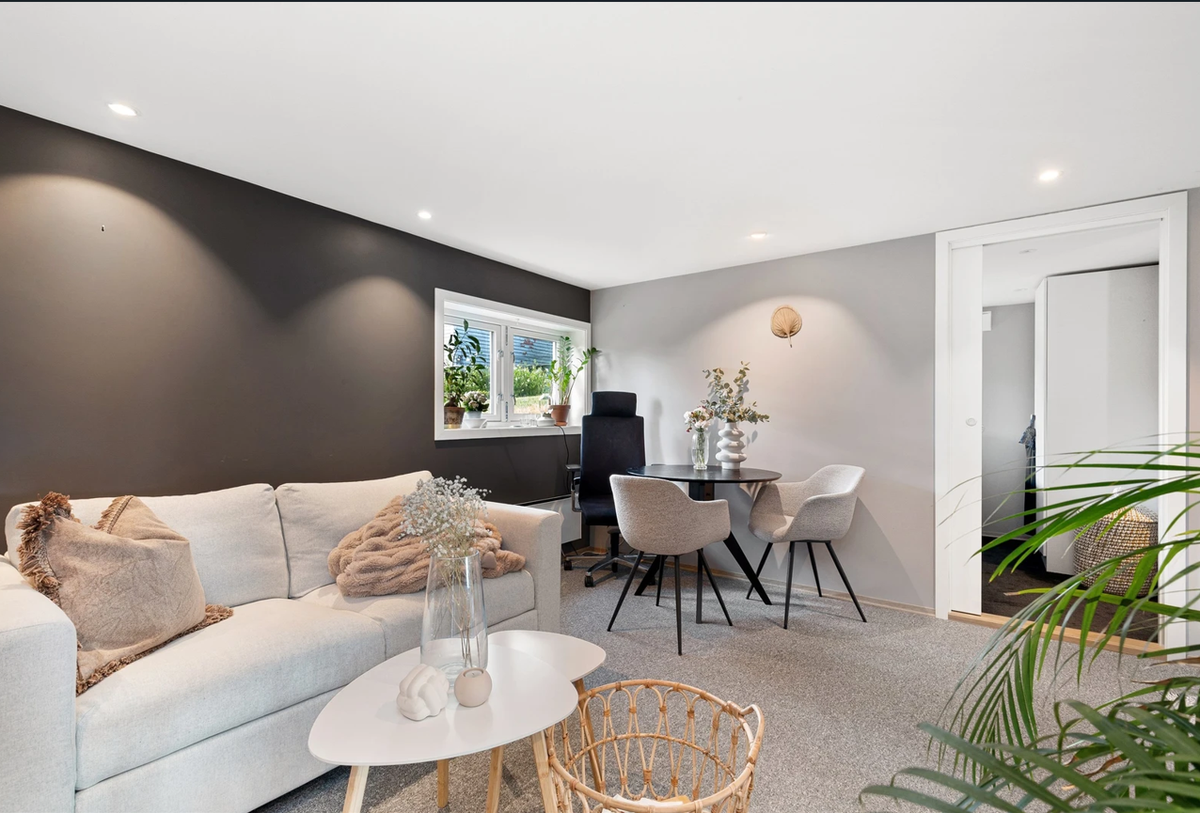 Det er en sokkelleilighet, men oppleves som lys og lett med flere vinduer og gode lysinnslipp - samtidig følelse av å være skjermet.