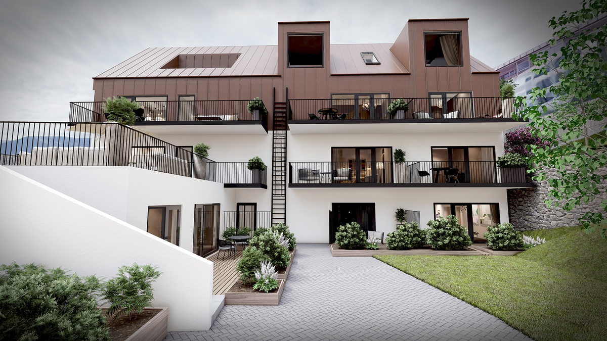 - Romslig balkong på 12 kvm med utsikt mot felles hage og kveldssol