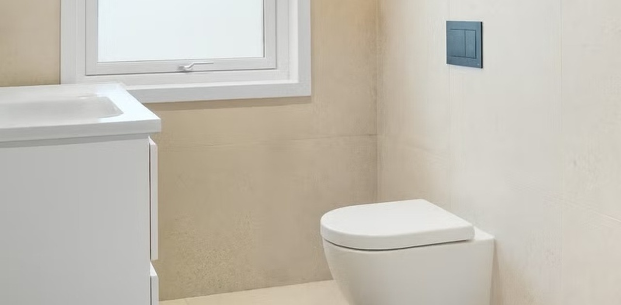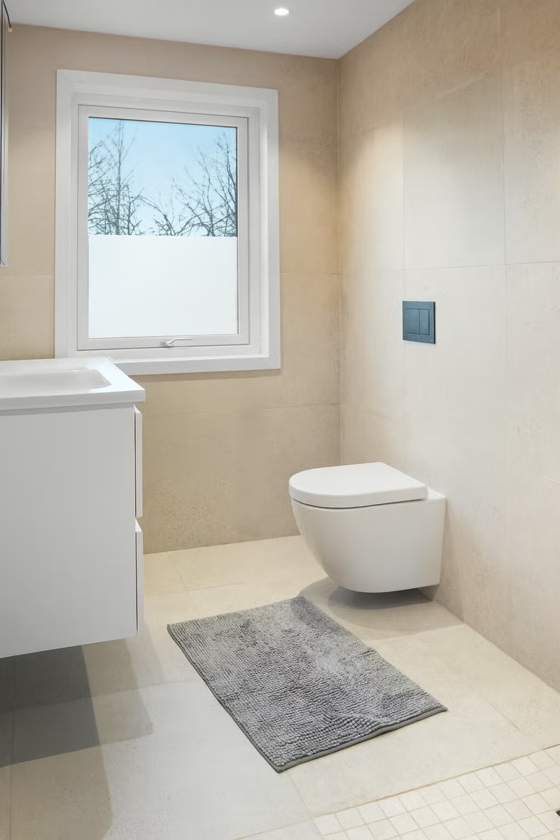 Flislagt bad med dusj, servant, nytt interiør og vegghengt toalett