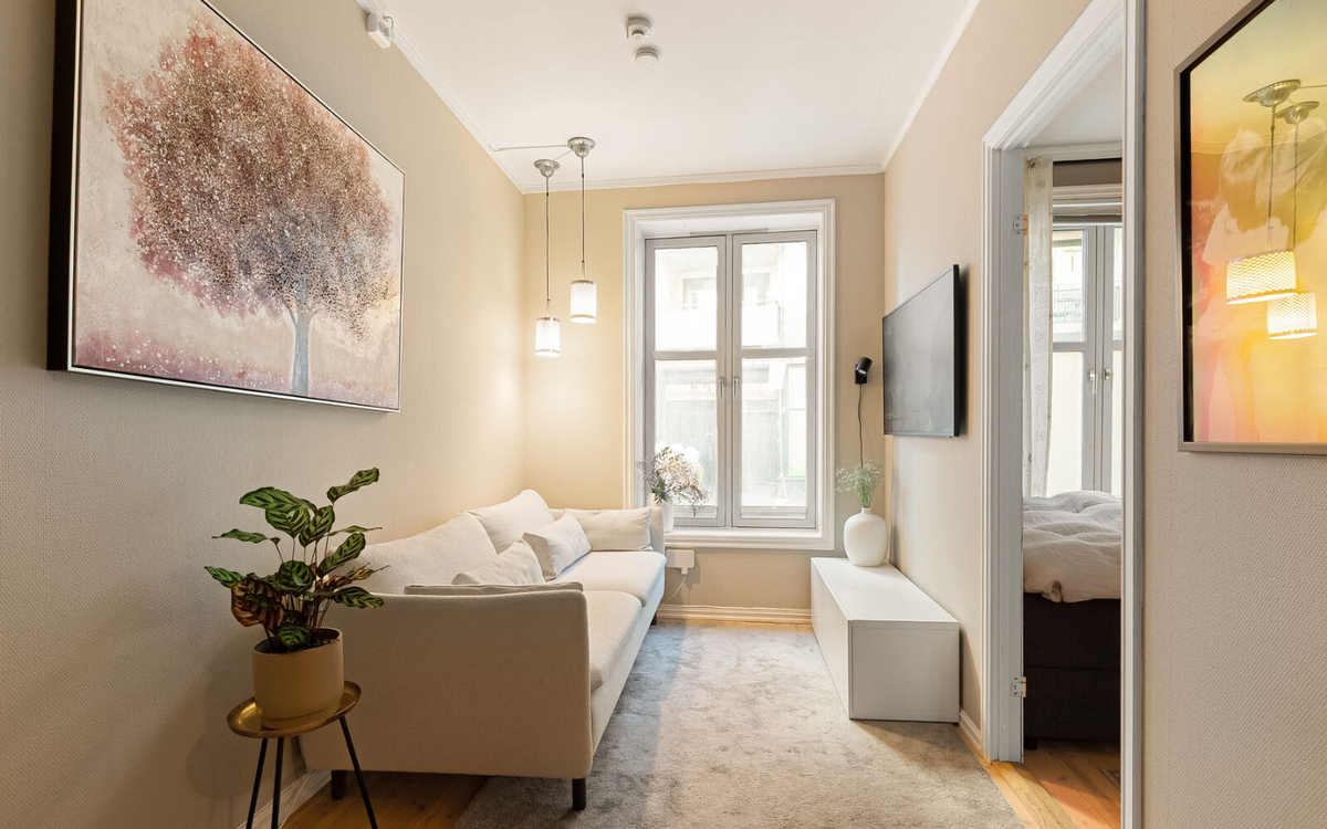 Sofa og spisebord medfølger. Bredbånd og TV-pakke er inkludert i leien. Fysisk TV medfølger ikke.